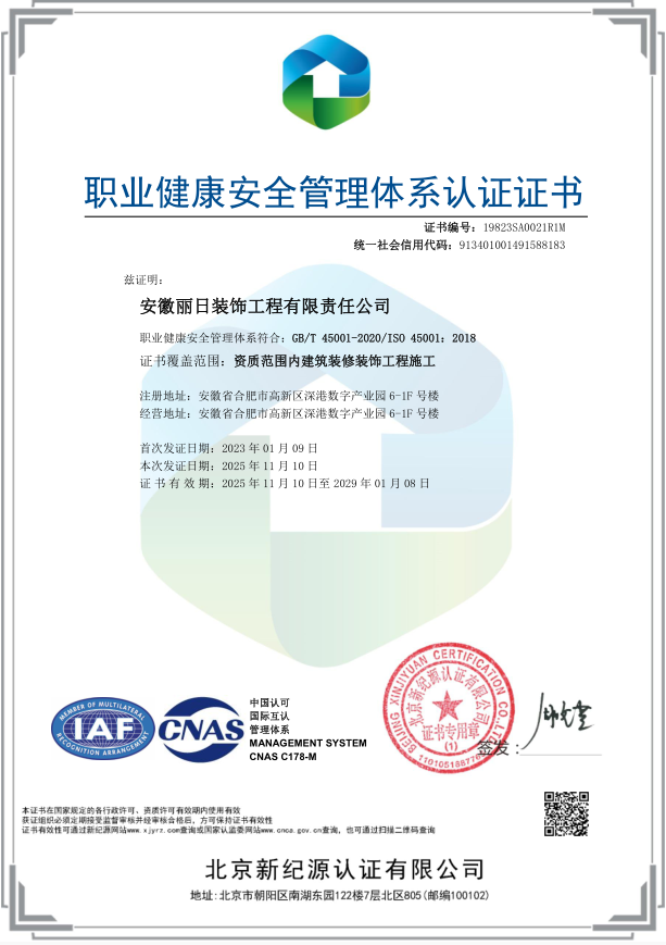 ISO职业健康安全管理体系认证证书